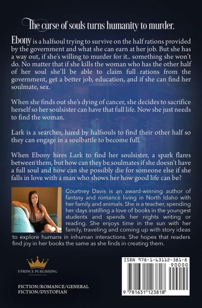 Ebony is a halfsoul trying to survive on the half rations provided by the government and what she can earn at her job. But she has a way out, if she's willing to murder for it... something she won't do. No matter that if she kills the woman who has the other half of her soul she'll be able to claim full rations from the government, get a better job, education, and if she can find her soulmate, sex. When she finds out she's dying of cancer, she decides to sacrifice herself so her soulsister can have that full life. Now she just needs to find the woman. Lark is a searcher, hired by halfsouls to find their other half so they can engage in a soulbattle to become full. When Ebony hires Lark to find her soulsister, a spark flares between them, but how can they be soulmates if she doesn't have a full soul and how can she possibly die for someone else if she falls in love with a man who shows her how good life can be? Deception, control, and a race against time. There's more to this curse than the gods or the government want people to know.