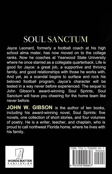 Jayce Leonard, formerly a football coach at his high school alma mater, has now moved on to the college ranks. Now he coaches at Yearwood State University where he once starred as a collegiate quarterback. Life is good for Jayce: a great job, a supportive and thriving family, and good relationships with those he works with. And yet, as a scandal begins to surface and rock his beloved football program, Jayce's character will be tested in a way never before experienced. The sequel to John Gibson's award-winning Soul Sprints, Soul Sanctum will have you cheering for the home team like never before.