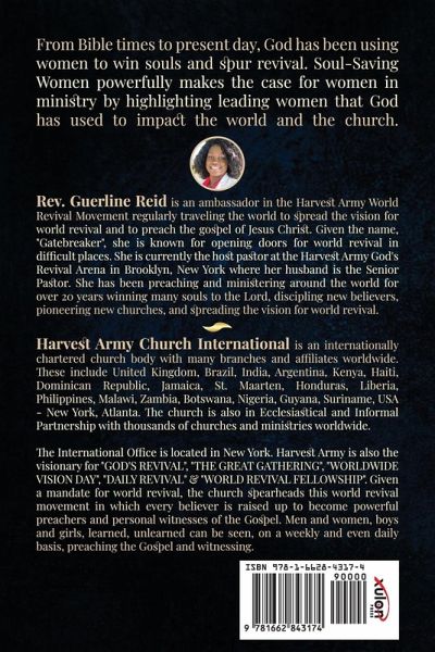 From Bible times to present day, God has been using women to win souls and spur revival. Soul-Saving Women powerfully makes the case for women in ministry by highlighting leading women that God has used to impact the world and the church. Harvest Army Church International is an internationally chartered church body with many branches and affiliates worldwide. These include United Kingdom, Brazil, India, Argentina, Kenya, Haiti, Dominican Republic, Jamaica, St, Maarten, Honduras, Liberia, Philippines, Malawi, Zambia, Botswana, Nigeria, Guyana, Suriname, USA- New York, Atlanta, the church is also in Ecclesiastical and Informal Partnership with thousands of churches and ministries worldwide. The International Office is located in New York. Harvest Army is also the visionary for "GOD'S REVIVAL", "THE GREAT GATHERING", "WORLD WIDE VISION DAY", "DAILY REVIVAL" & WORLD REVIVAL FELLOWSHIP". Given a mandate for world revival the church spearheads this world revival movement in which every believer is raised up to become powerful preachers and personal witness of the Gospel. Men and women, boys and girls, learned. unlearned can be seen, on a weekly and even daily basis, preaching the Gospel and witnessing. Rev. Guerline Reid is an ambassador in the Harvest Army World Revival Movement regularly traveling the world to spread the vision for the world revival and to preach the gospel of Jesus Christ. Given the name, "Gatebreaker", she is known for opening doors for the world of revival in difficult places. She is currently the host pastor at the Harvest Army God's Revival Arena in Brooklyn, New York where her husband is the Senior Pastor. She has been preaching and ministering around the world for over 20 years winning many souls to the Lord, discipling new believers, pioneering new churches, and spreading the vision for world revival.