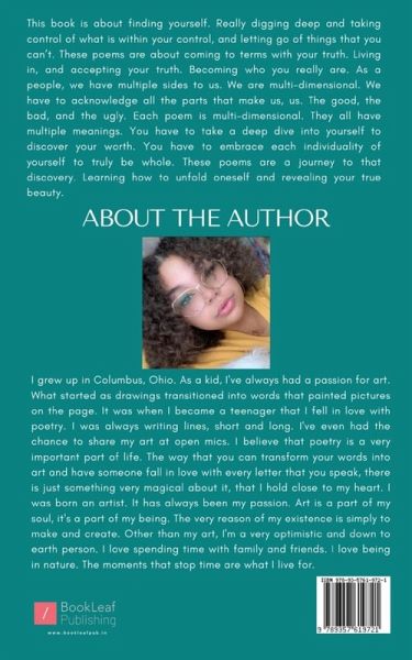 This book is about finding yourself. Really digging deep and taking control of what is within your control, and letting go of things that you can't. These poems are about coming to terms with your truth. Living in, and accepting your truth. Becoming who you really are. As a people, we have multiple sides to us. We are multi-dimensional. We have to acknowledge all the parts that make us, us. The good, the bad, and the ugly. Each poem is multi-dimensional. They all have multiple meanings. You have to take a deep dive into yourself to discover your worth. You have to embrace each individuality of yourself to truly be whole. These poems are a journey to that discovery. Learning how to unfold oneself and revealing your true beauty.