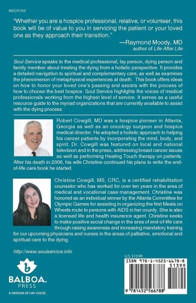 "Whether you are a hospice professional, relative, or volunteer, this book will be of value to you in servicing the patient or your loved one as they approach their transition." -Raymond Moody, MD, author of Life After Life Soul Service speaks to the medical professional, lay person, dying person and family member about treating the dying from a holistic perspective. It provides a detailed navigation to spiritual and complementary care, as well as examines the phenomenon of metaphysical experiences at death. This book offers ideas on how to honor your loved one's passing and assists with the process of how to choose the best hospice. Soul Service highlights the voices of medical professionals working from the highest level of service. It serves as a useful resource guide to the myriad organizations that are currently available to assist with the dying process.