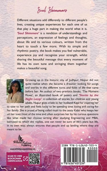 'Soul Shimmers' is a collection of poetry capturing myriad perceptions that come along with the seemingly little things in life but last forever in different shades and forms for each one of us. It is an expression of thoughts and feelings, written to follow a rhythm, keeping in touch with the music of the heart, which doesn't know anything other than beating as long as there is life in it. And Life itself, is one beautiful song with countless notes creating reverberating vibrations, an infinitesimally miniscule part of which are the renditions presented in this book, for you all to have a look! About the Author: In the crowd of people, she could be the one She could be a somebody, a nobody, she could be none What she was to the world, shouldn't take away from her For shouldn't she truly live the life she has got just for once! Hailing from Jodhpur, Nupur has counted stories and songs in the moments before her from the time she can remember, only beginning to write them now. An engineer and MBA, she has previously authored 'Stories by the Night Lamp' - a collection of short stories for young readers and believes pen and paper are not just a medium for expression but also an extraordinary resort to take the mind for a vacation whenever one feels like. She is on a path to self-discovery, learning to embrace herself in the process and imbibe the terrific skill of living in the moment from her son who is springy and zippy about life just about all the time.