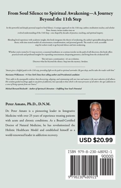"Soul Silence: The Path of Awakening" is a transformative guide by Peter Amato, Ph.D, DNM, that illuminates the universal journey toward spiritual awakening through meditation, mindfulness, and self-discovery. While drawing from Amato's personal recovery from addiction, this book transcends recovery literature to offer profound wisdom for anyone seeking deeper meaning, connection, and inner peace. Amato shares his remarkable evolution from a high-powered businessman consumed by material success to a dedicated meditation instructor, yoga teacher, and transpersonal psychotherapist. His awakening began when he was advised to practice meditation daily-a suggestion that changed his life forever and revealed that the spiritual connection he had been seeking existed within him all along. At its core, "Soul Silence" explores Amato's "Inner Harmony Approach," based on the understanding that human suffering stems from the disconnection between mind and spirit. Drawing from his extensive studies with spiritual masters and his own intensive meditation practice, he presents accessible, non-denominational techniques for quieting the mind and connecting with one's deeper essence. The book serves diverse readers: meditation newcomers who struggle with stillness, spiritual practitioners who feel stuck, longtime meditators seeking to deepen their practice, and anyone experiencing life's overwhelming challenges. Amato's approach adapts ancient wisdom into practical, modern techniques that resonate regardless of religious background, philosophical outlook, or previous meditation experience. Throughout "Soul Silence," Amato addresses common obstacles to contemplative practice, including skepticism, religious aversions, busy minds, and difficulty finding techniques that resonate. He provides tools for breaking through these barriers to discover the profound silence where transformation happens. Amato's personal narrative adds depth and authenticity to his teachings. His journey from materialism and addiction to spiritual awakening demonstrates how meditation can reveal our true nature beneath layers of conditioning. As Gandhi's quote in the book suggests, "In the attitude of silence the soul finds the path in a clearer light, and what is elusive and deceptive resolves itself into crystal clearness." This book serves as both inspiration and practical manual for anyone on a spiritual path. While it acknowledges Amato's background in Twelve Step spirituality, it extends far beyond recovery principles to universal truths about human consciousness. Mental health professionals, spiritual seekers, and anyone facing life's challenges will find valuable insights within these pages. With compassion and hard-won wisdom, Amato offers a roadmap for finding inner harmony through transformative contemplative practices. "Soul Silence" guides readers toward what the author discovered: that the peace and awakening we seek have been within us all along-we need only learn to sit still enough to experience it.