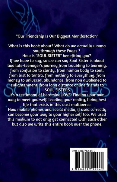 "Our friendship is our biggest manifestation" What is this book about? What do we actually wanna say through these Pages ? How is "SOUL SISTER" benefiting you? If we have to say, so we can say Soul Sister is about two late-teenager's journey from troubling to learning, from confusion to clarity, from human body to soul, from lust to tantra, from nothing to everything, from money to universal abundance, from non awakened to enlightenment, from long distance online friends to SOUL SISTERS. It's a testimony of becoming LOVE. Finding your own way to meet yourself. Leading your reality, living best life that exists in this vast multiverse. How mobile phones and social media, if used correctly can become your way to your higher self too. We used this medium to not only get connected with each other but also we write this entire book over the phone.