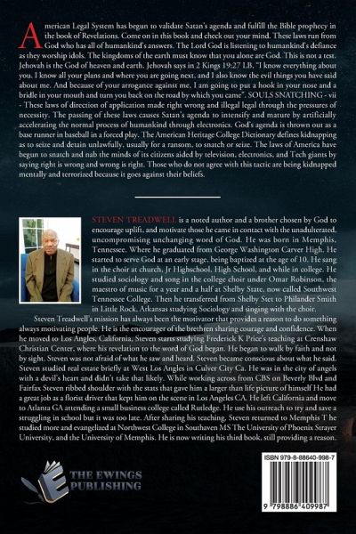 American Legal System has begun to validate Satan's agenda and fulfill the Bible prophecy in the book of Revelations. Come on in this book and check out your mind. These laws run from God who has all of humankind's answers. The Lord God is listening to humankind's defiance as they worship idols. The kingdoms of the earth must know that you alone are God. This is not a test. Jehovah is the God of heaven and earth. Jehovah says in 2 Kings 19:27 LB, "I know everything about you. I know all your plans and where you are going next, and I also know the evil things you have said about me. And because of your arrogance against me, I am going to put a hook in your nose and a bridle in your mouth and turn you back on the road by which you came". SOULS SNATCHING - vii - These laws of direction of application made right wrong and illegal legal through the pressures of necessity. The passing of these laws causes Satan's agenda to intensify and mature by artificially accelerating the normal process of humankind through electronics. God's agenda is thrown out as a base runner in baseball in a forced play. The American Heritage College Dictionary defines kidnapping as to seize and detain unlawfully, usually for a ransom, to snatch or seize. The laws of America have begun to snatch and nab the minds of its citizens aided by television, electronics, and Tech giants by saying right is wrong and wrong is right. Those who do not agree with this tactic are being kidnapped mentally and terrorized because it goes against their beliefs.