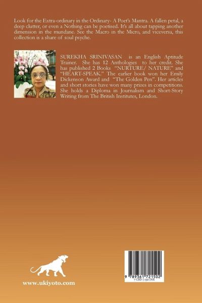 Look for the Extra-ordinary in the Ordinary- A Poet's Mantra. A fallen petal, a deep clutter, or even a Nothing can be poetised. It's all about tapping another dimension in the mundane. See the Macro in the Micro, and viceversa, this collection is a share of soul psyche.