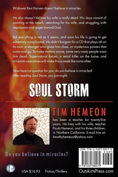 Widower Ken Hansen doesn't believe in miracles. He also doesn't believe that his wife is really dead. His days consist of painting at the beach, searching for his wife, and struggling with depression and anger toward God. But everything is not as it seems, and soon his life is going to get extremely complicated. He didn't bargain for a CD that plays all on its own, a stranger who gives him clues, or mysterious powers that come and go. To make matters worse, some very nasty people want him dead. Supernatural forces, a serial killer on the loose, and al-Qaida operatives involved in a conspiracy targeting the Pope and the President will make this a thriller you won't want to put down. Now here's a question for you: do you believe in miracles? After reading Soul Storm, you just might.
