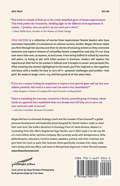 From late night diaper changes to blueprints for how to succeed in business, Soul Success is a collection of memoirs from inspirational women who have overcome impossible circumstances to achieve success. Using irreverent humor and specific action steps, author Megan McCann introduces the battles she faced throughout her life as a little girl and woman who dared to dream. McCann takes you first through her journey bringing to light common themes of unhealthy female competition and why it's our duty now more than ever, as women, to lock arms. From being bullied in school by her teacher and her peers, to being at war with other women in business, you'll explore the common themes that led to failure in her career and personal life. After meeting the women highlighted in this book, you'll come to understand the mission behind the book is not just about women rising together, but after reading the memoirs, you'll also leave with a toolkit for how to turn sh*t into gold. Be ready to laugh, snort, cry, and feel good all at the same time. Contributing authors include: Sara Connell, Jennifer Ludington, Dr. Kathryn Guylay, Jamie Green, Leah Warshawski, Jaime Rivetts, Pirie Grossman, Barbara Kamba-Nyathi, Rose Jubb, Jesse Johnson, Kathy Haan, and Jaya Rose.