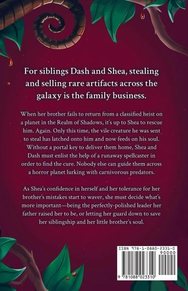 If the horror planet they're trapped on doesn't kill them first, their sibling rivalry just might . . . For siblings Dash and Shea, stealing and selling rare artifacts across the galaxy is the family business. When her brother fails to return from a classified heist on a planet in the Realm of Shadows, it's up to Shea to rescue him. Again. Only this time, the vile creature he was sent to steal has latched onto him and now feeds on his soul. Without a portal key to deliver them home, Shea and Dash must enlist the help of a runaway spellcaster in order to find the cure. Nobody else can guide them across a horror planet lurking with carnivorous predators. As Shea's confidence in herself and her tolerance for her brother's mistakes start to waver, she must decide what's more important-being the perfectly-polished leader her father raised her to be, or letting her guard down to save her siblingship and her little brother's soul.
