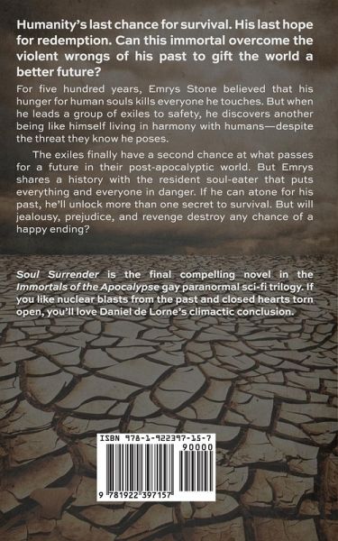 Humanity's last chance for survival. His last hope for redemption. Can this immortal overcome the violent wrongs of his past to gift the world a better future? For five hundred years, Emrys Stone believed that his hunger for human souls kills everyone he touches. But when he leads a group of exiles to safety, he discovers another being like himself living in harmony with humans-despite the threat they know he poses. The exiles finally have a second chance at what passes for a future in their post-apocalyptic world. But Emrys shares a history with the resident soul-eater that puts everything and everyone in danger. If he can atone for his past, he'll unlock more than one secret to survival. But will jealousy, prejudice, and revenge destroy any chance of a happy ending? Soul Surrender is the final compelling novel in the Immortals of the Apocalypse gay paranormal sci-fi trilogy. If you like nuclear blasts from the past and closed hearts torn open, you'll love Daniel de Lorne's climactic conclusion.
