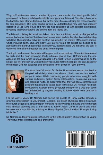 Why do Christians espouse a promise of joy and peace while often leading a life full of unresolved problems, relational conflicts, and personal failures? Christians have won the battle for their eternal destinies, but far too many times are losing the present conflict for soul prosperity. This inner conflict is won by understanding how God has uniquely designed us as living souls and how He has equipped us with Biblical instructions, revealing that our problems are solved from the inside out. The failure to distinguish what has taken place our spirit and what has happened to our soul when we trust in Christ can lead to confusion and doubts about our relationship with God. The subject of salvation must be examined in the context of the entire person, which includes spirit, soul, and body. Just as we would not expect our bodies to be perfect the moment Christ comes into our lives, neither should we think that the soul is delivered from all the baggage we bring from our past. Through the power of the word "forgive," the Christian can deal with these past circumstances and begin the journey towards soul health. The trip to wellness on the inside will happen as the depository of the mind is renewed by truth and the heart discovers God's ultimate goal of love. Unfortunately the one aspect of the soul which is unsalvageable is the flesh, which is determined to be the king of our will and leaves God as the only recourse for the healing of the soul. Discover the Biblical GPS for guidance and direction to inner peace in "Soul Survival."