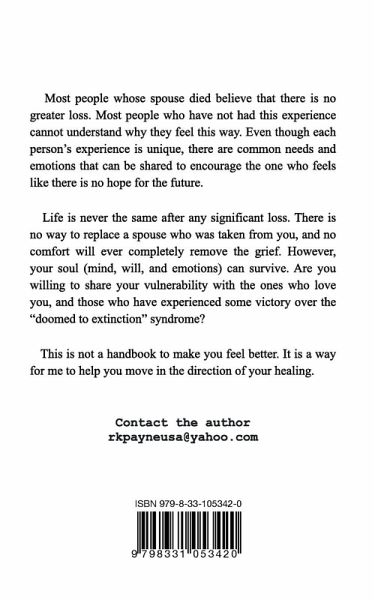 Most people whose spouse died believe that there is no greater loss. Most people who have not had this experience cannot understand why they feel this way. Even though each person's experience is unique, there are common needs and emotions that can be shared to encourage the one who feels like there is no hope for the future. Life is never the same after any significant loss. There is no way to replace a spouse who was taken from you, and no comfort will ever completely remove the grief. However, your soul (mind, will, and emotions) can survive. Are you willing to share your vulnerability with the ones who love you, and those who have experienced some victory over the "doomed to extinction" syndrome? This is not a handbook to make you feel better. It is a way for me to help you move in the direction of your healing.