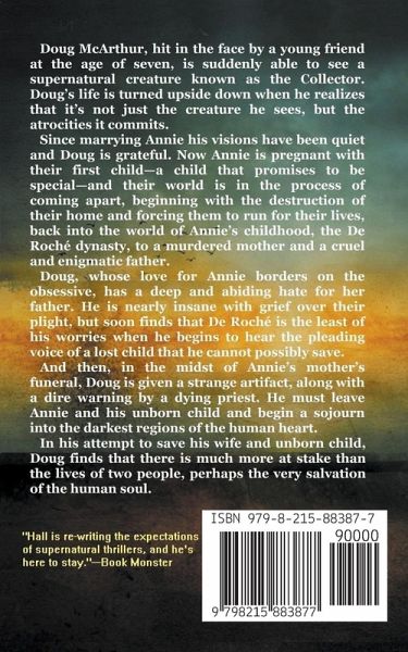 The Brotherhood of the Order is one of the oldest and most mysterious organizations on earth. Those who know of their existence are few. Fewer still understand who they are; a band of brothers once known as the Knights Templar. Persecuted and murdered for their beliefs, the ultra-secret Order has survived the ages to protect one of the most carefully guarded secrets in human history, an object so enigmatic and powerful that in the wrong hands it could wreak havoc upon the earth. In the right hands it just might have the power to save humanity from its own destructive impulses. Doug McArthur, hit in the face by a young friend at the age of seven, is suddenly able to see a supernatural creature who calls itself Collector. Doug's life is turned upside down when he realizes that it's not just the creature he sees, but the atrocities it commits. Since marrying Annie his visions have been quiet and Doug is grateful. Now Annie is pregnant with their first child-a child who promises to be special-and their world is in the process of coming apart, beginning with the destruction of their home and forcing them to run for their lives, back into the world of Annie's childhood, the De Roché dynasty, to a murdered mother and a cruel and enigmatic father. Doug, whose love for Annie borders on the obsessive, has a deep and abiding hate for her father. He is nearly insane with grief over their plight, but soon finds that De Roché is the least of his worries when he begins to hear the pleading voice of a lost child that he cannot possibly save. And then, in the midst of Annie's mother's funeral, Doug is given a strange artifact along with a dire warning by a dying priest. The artifact, purported to be the tip of the spear that pierced Christ's rib cage at the crucifixion, is only part of the story, for Doug must take the artifact, leave Annie and his unborn child and begin a sojourn into the darkest regions of the human heart. In his attempt to save his wife and unborn child, Doug finds that there is much more at stake than the lives of two people, perhaps the very salvation of the human soul.