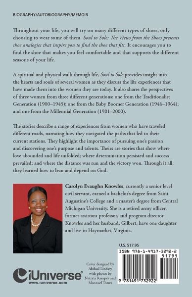Throughout your life, you will try on many different types of shoes, only choosing to wear some of them. Soul to Sole: The Views from the Shoes presents shoe analogies that inspire you to find the shoe that fits. It encourages you to find the shoe that makes you feel comfortable and that supports the different seasons of your life. A spiritual and physical walk through life, Soul to Sole provides insight into the hearts and souls of several women as they discuss the life experiences that have made them into the women they are today. It also shares the perspectives of three women from three different generations: one from the Traditionalist Generation (1900-1945); one from the Baby Boomer Generation (1946-1964); and one from the Millennial Generation (1981-2000). The stories describe a range of experiences from women who have traveled different roads, narrating how they navigated the paths that led to their current stations. They highlight the importance of pursuing one's passion and discovering one's purpose and talents. Theirs are stories that show where love abounded and life unfolded; where determination persisted and success prevailed; and where the distance was run and the victory won. Through it all, they learned how to lean and depend on God.