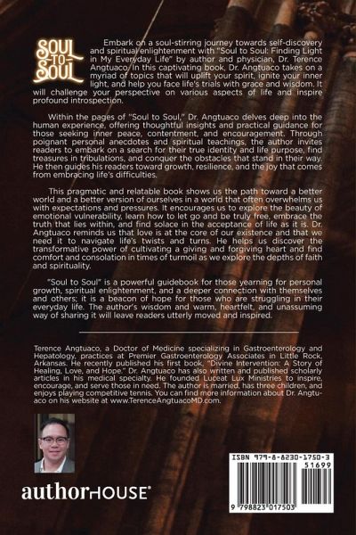 Embark on a soul-stirring journey towards self-discovery and spiritual enlightenment with "Soul to Soul: Finding Light in My Everyday Life" by author and physician, Dr. Terence Angtuaco. In this captivating book, Dr. Angtuaco takes on a myriad of topics that will uplift your spirit, ignite your inner light, and help you face life's trials with grace and wisdom. It will challenge your perspective on various aspects of life and inspire profound introspection. Within the pages of "Soul to Soul," Dr. Angtuaco delves deep into the human experience, offering thoughtful insights and practical guidance for those seeking inner peace, contentment, and encouragement. Through poignant personal anecdotes and spiritual teachings, the author invites readers to embark on a search for their true identity and life purpose, find treasures in tribulations, and conquer the obstacles that stand in their way. He then guides his readers toward growth, resilience, and the joy that comes from embracing life's difficulties. This pragmatic and relatable book shows us the path toward a better world and a better version of ourselves in a world that often overwhelms us with expectations and pressures. It encourages us to explore the beauty of emotional vulnerability, learn how to let go and be truly free, embrace the truth that lies within, and find solace in the acceptance of life as it is. Dr. Angtuaco reminds us that love is at the core of our existence and that we need it to navigate life's twists and turns. He helps us discover the transformative power of cultivating a giving and forgiving heart and find comfort and consolation in times of turmoil as we explore the depths of faith and spirituality. "Soul to Soul" is a powerful guidebook for those yearning for personal growth, spiritual enlightenment, and a deeper connection with themselves and others; it is a beacon of hope for those who are struggling in their everyday life. The author's wisdom and warm, heartfelt, and unassuming way of sharing it will leave readers utterly moved and inspired.