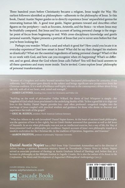Three hundred years before Christianity became a religion, Jesus taught the Way. His earliest followers identified as philosophers--adherents to the philosophy of Jesus. In this book, Daniel Austin Napier guides us to directly experience Jesus' unparalleled genius for renovating human life. A good tour guide, Napier gestures toward and describes other figures on the periphery--such as Socrates, Aristotle, and the Stoics--to whom Jesus may be fruitfully compared. But Jesus and his account of lasting personal change is the singular point of focus from beginning to end. With cross-disciplinary knowledge and gentle personal warmth, Napier presents a portrait of Jesus that you've never seen before but that you've been looking for. Perhaps you wonder: What's a soul and what's it good for? How could you locate it in everyday experience? Just how smart is Jesus? What did he say that changed his students so drastically? What are the essential ingredients of lasting personal change? What's it like to co-work with God, and how can you recognize when it's happening? What's so different, and so good, about the God whom Jesus calls Father? You will find lucid answers to all these questions and many more inside. You're invited. Come explore Jesus' philosophy of personal transformation.