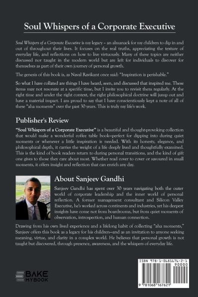 Soul Whispers of a Corporate Executive is my legacy - an almanack for my children to dip in and out of throughout their lives. It focuses on the real truths, appreciating the texture of everyday life, and reflections on how to live virtuously. Many of these topics are neither discussed nor taught in the modern world but are left for individuals to discover for themselves as part of their own journey of personal growth. The genesis of this book is, as Naval Ravikant once said: "Inspiration is perishable." So what I have collated are things I have heard, seen, and discussed that inspired me. These items may not resonate at a specific time, but I invite you to revisit them regularly. At the right time and under the right context, the right philosophical doctrine will jump out and have a material impact. I am proud to say that I have conscientiously kept a note of all of these "aha moments" over the past 30 years. This is truly my life's work. About Sanjeev Gandhi Sanjeev Gandhi has spent over 30 years navigating both the outer world of corporate leadership and the inner world of personal reflection. A former management consultant and Silicon Valley Executive, he's worked across continents and industries, yet his deepest insights have come not from boardrooms, but from quiet moments of observation, introspection, and human connection. Drawing from his own lived experience and a lifelong habit of collecting "aha moments," Sanjeev offers this book as a legacy for his children-and as an invitation to anyone seeking meaning, virtue, and clarity in a complex world. He believes that personal growth is not taught but discovered, through presence, awareness, and the whispers of everyday life.