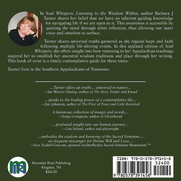 Soul Whispers: Listening to the Wisdom Within is an inspirational book of poetic verse containing universal truths and wisdom. A second edition was released in 2023. Life often presents us with challenges and decision points that causes us to lose sight of how to make the best choices. The author believes insight to meet these challenges lies within us, if we listen to our inner knowing. She attributes her understanding and wisdom to her deep roots in Appalachia and the teachings of her ancestors. Suggestions are offered in the introduction on how to tap into what we already know to discern the difference between fear and intuition. To lend visual interpretation to each poem or verse, the author includes images for the reader to contemplate. Soul Whispers offers daily inspiration suitable for anyone. Since initial release in 2018, Soul Whispers: Listening to the Wisdom Within has received praise from authors and poets alike for its profound insights and luminous images. This updated edition offers in-depth insight into the author's heritage and what it's like to grow up in the Appalachian Mountains. This book of verse is a timely contemplative guide for these times and is an ideal gift book.