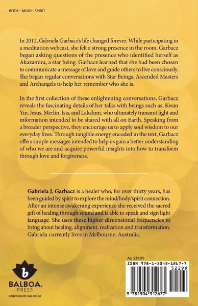 In 2012, Gabriela Garbacz's life changed forever. While participating in a meditation webcast, she felt a strong presence in the room. Garbacz began asking questions of the presence who identified herself as Akazamira, a star being. Garbacz learned that she had been chosen to communicate a message of love and guide others to live consciously. And so began her regular conversations with Star Beings, Ascended Masters, and Archangels recorded over a period of time. In the first collection of these enlightening conversations, Garbacz reveals the fascinating details of her talks with beings such as, Kwan Yin, Jesus, Merlin, Isis, and Lakshmi, who ultimately transmit light and information intended to be shared with all on Earth. Speaking from a broader perspective, they encourage us to apply soul wisdom to our everyday lives. Through tangible energy encoded in the text, Garbacz offers simple messages intended to help us gain a better understanding of who we are and acquire powerful insights into how to transform through love and forgiveness.