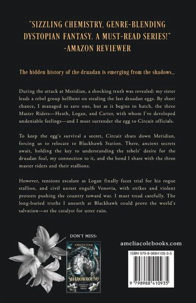 The hidden history of the druadan is emerging from the shadows... During the attack at Meridian, a shocking truth was revealed: my sister leads a rebel group hellbent on stealing the last druadan eggs. By sheer chance, I managed to save one, but as it begins to hatch, the three Master Riders-Heath, Logan, and Carter, with whom I've developed undeniable feelings-and I must surrender the egg to Circuit officials. To keep the egg's survival a secret, Circuit shuts down Meridian, forcing us to relocate to Blackhawk Station. There, ancient secrets await, holding the key to understanding the rebels' desire for the druadan foal, my connection to it, and the bond I share with the three master riders and their stallions. However, tensions escalate as Logan finally faces trial for his rogue stallion, and civil unrest engulfs Venovia, with strikes and violent protests pushing the country toward war. I must tread carefully. The long-buried truths I unearth at Blackhawk could prove the world's salvation-or the catalyst for utter ruin.