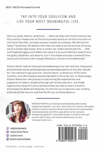 All of our goals, dreams, ambitions . . . where do they stem from? And why are they such an integral part of the soul's journey during our limited time here on this Earth? So often, we seek answers outside of ourselves. We fall into the "when I" syndrome. We believe that when we make a certain amount of money, live in a certain size house, drive a certain car, hold a certain job title . . . that we'll finally be happy and fulfilled. But what if true soul fulfillment doesn't lie in the goals, ambitions, and dreams, but in the simple everyday moments? How would your outlook on life change? Would you choose to live differently? Kristen Martin had her first spiritual awakening in her late twenties. Exhausted and overwhelmed by societal pressures and expectations of who she "should be", she realized it was up to her—and her alone—to break out of the mind-numbing, soul-dimming box society had tried to force her into. In these pages, Kristen shares her own journey in overcoming the expectations and judgments of others, breaking through self-limiting barriers, and finally tapping into a level of truth so profound that she had to invent a word to encompass its depth and meaning. It's time for you to discover your soulflow, embrace all that you are, and live the life you so wholly deserve.