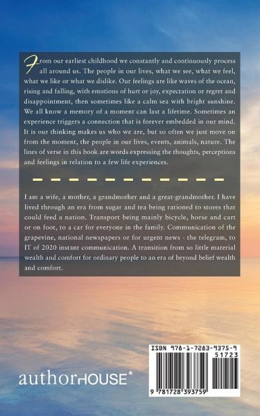 From our earliest childhood we constantly and continuously process all around us. The people in our lives, what we see, what we feel, what we like or what we dislike. Our feelings are like waves of the ocean, rising and falling, with emotions of hurt or joy, expectation or regret and disappointment, then sometimes like a calm sea with bright sunshine. We all know a memory of a moment can last a lifetime. Sometimes an experience triggers a connection that is forever embedded in our mind. It is our thinking makes us who we are, but so often we just move on from the moment, the people in our lives, events, animals, nature. The lines of verse in this book are words expressing the thoughts, perceptions and feelings in relation to a few life experiences.