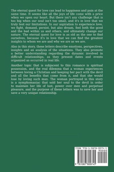 The eternal quest for love can lead to happiness and pain at the same time. It seems like all the joys of life come with a price when we open our heart. But there isn't any challenge that is too big when our soul isn't too small, and it's in love that we truly test our limitations. In our aspiration to experience love, we fight, demand, persist, but also dream, feel both the good and the bad within us and others, and ultimately change our nature. The eternal quest for love is as old as the one to find ourselves, because it's in love that we can find the greatest insights to whom we are and why we are as we are. Also in this story, these letters describe emotions, perspectives, insights and an analysis of the situations. They also promote a better understanding regarding the dynamic involved in difficult relationships, as they present dates and events organized as occurred in real life. Another topic that is subjacent to this romance is spiritual possession, and the real dilemma that a woman experiences between loving a Christian and keeping her pact with the devil and all the benefits that come from it, and that she would lose by loving such man. The woman portrayed in this story is a nymphomaniac that sold her soul to the devil in order to maintain her life of lust, power over men and perpetual pleasure, and the purpose of these letters was to save her and save a very unique relationship.