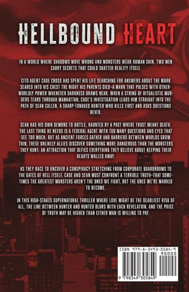 In a world where shadows move wrong and monsters wear human skin, two men carry secrets that could shatter reality itself. CITD Agent Cade Cross has spent his life searching for answers about the mark seared into his chest the night his parents died. When a string of ritualistic murders tears through Manhattan, Cade's investigation leads him straight into the path of Sean Cullen, a sharp-tongued hunter who kills first and asks questions never. Sean has his own demons to battle, haunted by a past where trust meant death. The last thing he needs is a federal agent with too many questions and eyes that see too much. But as ancient forces gather and barriers between worlds grow thin, these unlikely allies discover something more dangerous than the monsters they hunt: an attraction that defies everything they believe about keeping their hearts walled away. As they race to uncover a conspiracy stretching from corporate boardrooms to the gates of Hell itself, Cade and Sean must confront a terrible truth-that sometimes the greatest monsters aren't the ones we fight, but the ones we're marked to become. In this high-stakes supernatural thriller where love might be the deadliest risk of all, the line between hunter and hunted blurs with each revelation. And the price of truth may be higher than either man is willing to pay.