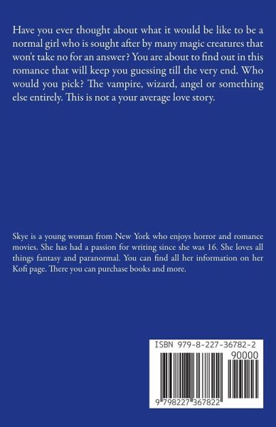 Have you ever thought about what it would be like to be a normal girl who is sought after by many magic creatures that won't take no for an answer? You are about to find out in this romance that will keep you guessing till the very end. Who would you pick? The vampire, wizard, angel or something else entirely. This is not a your average love story.