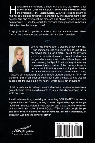 Writing has always been a creative outlet in my life. It was common for me at a young age, to take off on my bicycle looking for a place I could call my own within the serenity of nature. I would sit down on the grass by a stream, and pull out the notepad and pencil from my backpack to write poetry. Attempting to express the inspiration of the day, my thoughts became as fluid as the water trickling down before me. Sometimes I would write short stories. Later, I discovered that putting words to music brought additional life to my thoughts. Still an amateur at writing but it didn't matter. Writing was an escape into the love I felt in my heart. I wrote purely for enjoyment. I finally sought out to make my dream of writing a novel come true. Even given the time restraints within our lives, my husband encouraged me to write my book. As a first-time author, I can tell you that writing SOULMATES has been a joyous adventure. Often my writing process begins with prayer. Although laced with science fiction, I hope people can shake out the treasures of truth within my novel. I want SOULMATES to make people happy and allow them to believe not only in romance, but most importantly to believe in God and the power of prayer.