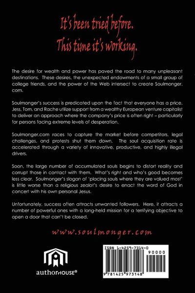 The first chapter of the book suggests this isn't a story for the conservative elder's church league. Ensuing chapters confirm it. Jess nears college graduation and finds the source of goodness in his life taken, like his faith when he was younger. His emerging role as the head of Soulmonger.com ultimately uncovers the answers to nagging questions of what his purpose in life was meant to be; Jonathon travels an increasingly disturbing and reality-bending path of fundamentalist Christian activism supported by his good pal Jesus; Ty progresses from his role as a drug-selling gang member to a disquieting servitude that is much worse; and Tom helps uncover an extraordinary and long history of a powerful group seeking souls for their frightening purpose. This highly original and startling horror novel is crafted from tightly integrated plotlines and filled with stunning revelations that compels the reader to continue down a dangerous path.