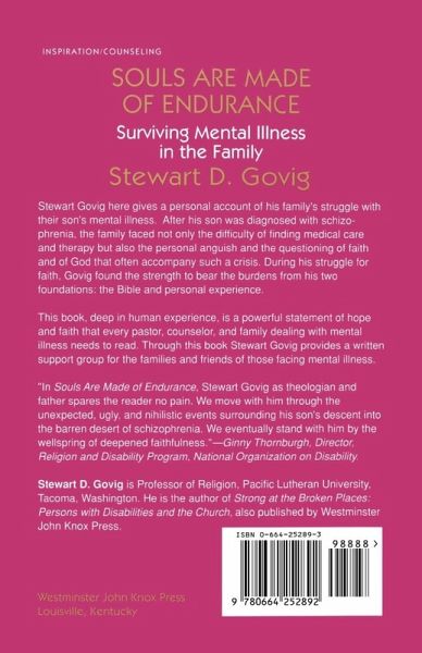 Stewart Govig here gives a personal account of his family's struggle with their son's mental illness. After his son was diagnosed with schizophrenia, the family faced not only the difficulty of finding medical care and therapy but also the personal anguish and the questioning of faith and of God that often accompany such a crisis. During his struggle for faith, Govig found the strength to bear the burdens from his two foundations: the Bible and personal experience. This book, deep in human experience, is a powerful statement of hope and faith that every pastor, counselor, and family dealing with mental illness needs to read. Through this book Stewart Govig provides a written support group for the families and friends of those facing mental illness.