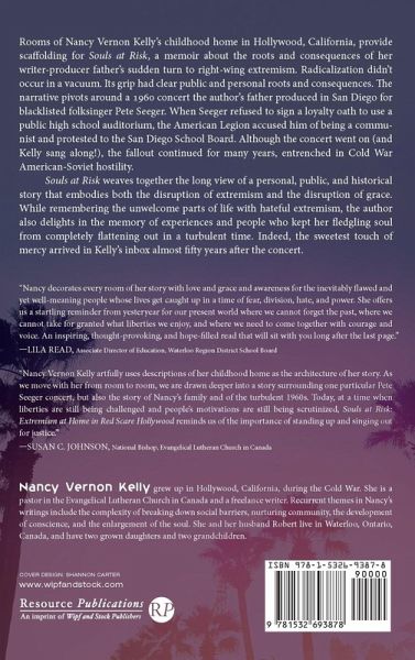 Rooms of Nancy Vernon Kelly's childhood home in Hollywood, California, provide scaffolding for Souls at Risk, a memoir about the roots and consequences of her writer-producer father's sudden turn to right-wing extremism. Radicalization didn't occur in a vacuum. Its grip had clear public and personal roots and consequences. The narrative pivots around a 1960 concert the author's father produced in San Diego for blacklisted folksinger Pete Seeger. When Seeger refused to sign a loyalty oath to use a public high school auditorium, the American Legion accused him of being a communist and protested to the San Diego School Board. Although the concert went on (and Kelly sang along!), the fallout continued for many years, entrenched in Cold War American-Soviet hostility. Souls at Risk weaves together the long view of a personal, public, and historical story that embodies both the disruption of extremism and the disruption of grace. While remembering the unwelcome parts of life with hateful extremism, the author also delights in the memory of experiences and people who kept her fledgling soul from completely flattening out in a turbulent time. Indeed, the sweetest touch of mercy arrived in Kelly's inbox almost fifty years after the concert.