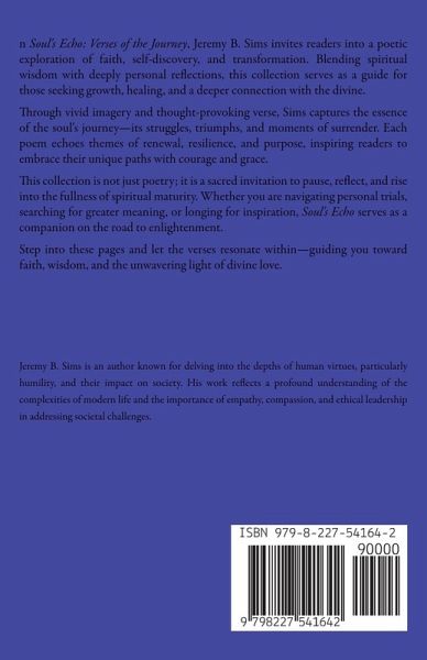 n Soul's Echo: Verses of the Journey, Jeremy B. Sims invites readers into a poetic exploration of faith, self-discovery, and transformation. Blending spiritual wisdom with deeply personal reflections, this collection serves as a guide for those seeking growth, healing, and a deeper connection with the divine. Through vivid imagery and thought-provoking verse, Sims captures the essence of the soul's journey-its struggles, triumphs, and moments of surrender. Each poem echoes themes of renewal, resilience, and purpose, inspiring readers to embrace their unique paths with courage and grace. This collection is not just poetry; it is a sacred invitation to pause, reflect, and rise into the fullness of spiritual maturity. Whether you are navigating personal trials, searching for greater meaning, or longing for inspiration, Soul's Echo serves as a companion on the road to enlightenment. Step into these pages and let the verses resonate within-guiding you toward faith, wisdom, and the unwavering light of divine love.
