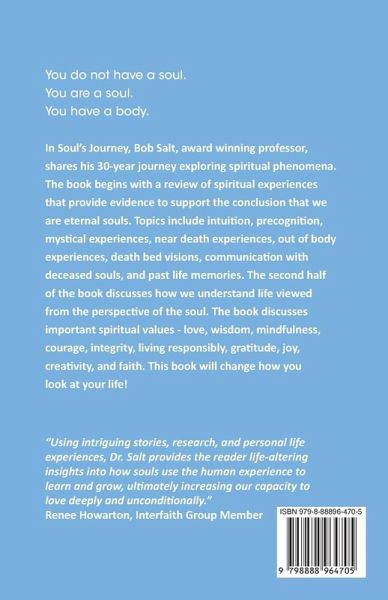In Soul's Journey: Remembering Who We Are, Bob Salt, award winning professor, shares his 30-year journey exploring spiritual phenomena. The book begins with a review of spiritual experiences that provide evidence for the conclusion that we are eternal souls. Topics include intuition, precognition, mystical experiences, near death experiences, out of body experiences, death bed visions, communication with deceased souls, and past life memories. The second half of the book discusses how we might approach life if viewed from the perspective of the soul. Discussing important spiritual values - love, wisdom, mindfulness, courage, integrity, living responsibly, gratitude, joy, creativity, and faith from the perspective of the soul.