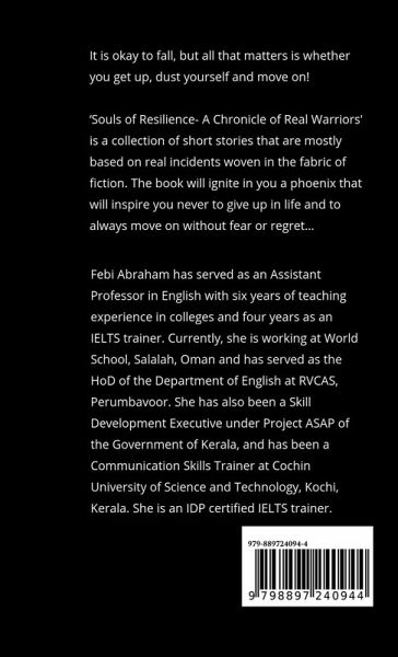It is okay to fall, but all that matters is whether you get up, dust yourself, and move on! 'Souls of Resilience- A Chronicle of Real Warriors' is a collection of short stories that are mostly based on real incidents woven in the fabric of fiction. The book will ignite in you a phoenix that will inspire you never to give up in life and to always move on without fear or regret...