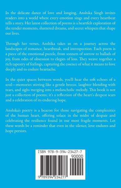 In the delicate dance of love and longing, Anshika Singh invites readers into a world where every emotion sings and every heartbeat tells a story. Her latest collection of poems is a heartfelt exploration of the tender moments, shattered dreams, and secret whispers that shape our lives. Through her verses, Anshika takes us on a journey across the landscapes of romance, heartbreak, and introspection. Each poem is a piece of the emotional puzzle, from sonnets of sorrow to ballads of joy, from odes of obsession to elegies of loss. They weave together a rich tapestry of feelings, capturing the essence of what it means to love deeply and to endure heartache. In the quiet spaces between words, you'll hear the soft echoes of a soul-memories stirring like a gentle breeze, laughter blending with tears, and sighs merging into a melancholic melody. This book is not just a collection of poems; it's a reflection of the heart's deepest scars and a celebration of its enduring hope. Anshika's poetry is a beacon for those navigating the complexities of the human heart, offering solace in the midst of despair and celebrating the resilience found in our most fragile moments. Let these words be a reminder that even in the silence, love endures and hope persists.