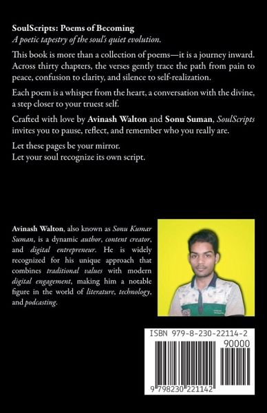 In SoulScripts: Poems of Becoming, authors Avinash Walton and Sonu Suman pen down a journey of self-discovery, love, loss, and spiritual awakening-one verse at a time. This 30-chapter poetry collection isn't just a book-it's a soulful mirror reflecting the raw emotions and untold stories we often silence within ourselves. From the quiet moments of introspection to the chaos of dreams unfulfilled, every poem is a whisper from the soul-gentle, powerful, and deeply human. Rooted in tradition yet reaching forward with hope, this book touches themes of identity, family, love, pain, purpose, and transcendence. Each chapter is a phase. Each verse, a voice. And together, they form a sacred manuscript-a SoulScript-of what it truly means to become. Whether you're a lover of poetry or a seeker of meaning, SoulScripts will leave you inspired, awakened, and quietly transformed.