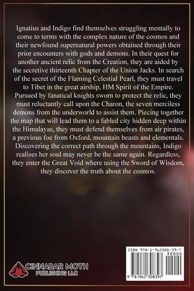 Ignatius and Indigo find themselves struggling mentally to come to terms with the complex nature of the cosmos and their newfound supernatural powers obtained through their prior encounters with gods and demons. In their quest for another relic from the Creation, they are aided by the secretive thirteenth Chapter of the Union Jacks. In search of the secret of the Flaming Celestial Pearl, they must travel to Tibet in the great airship, HM Spirit of the Empire. Pursued by fanatical knights sworn to protect the relic, they must reluctantly call upon the Charon, the seven merciless demons from the underworld to assist them. Piecing together the map that will lead them to a fabled city hidden deep within the Himalayas, they must defend themselves from air pirates, a previous foe from Oxford, mountain beasts and elementals. Discovering the correct path through the mountains, Indigo realises her soul may never be the same again. Regardless, they enter the Great Void where using the Sword of Wisdom, they discover the truth about the cosmos.