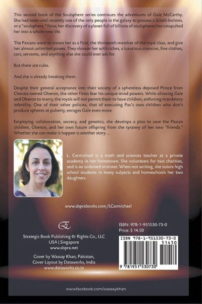 This second book of the Soulsphere series continues the adventures of Gale McCarthy. She had been until recently one of the only people in the galaxy to possess a Sciath Inchinn, or a "soulsphere." Now, her discovery of a planet full of billions of soulspheres has catapulted her into a whole new life. The Paxians want to crown her as a First, the thirteenth member of the royal class, and give her almost unlimited power. They shower her with riches, a luxurious mansion, fine clothes, cars, servants, and anything else she could ever ask for. But there are rules. And she is already breaking them. Despite their general acceptance into their society of a sphereless deposed Prince from Choraia named Oberon, the other Firsts fear his unique mind powers. While allowing Gale and Oberon to marry, the royals will not permit them to have children, enforcing mandatory infertility. One of their other policies, that of executing Pax’s own children who don’t produce spheres at puberty, enrages Gale even more. Employing collaboration, secrecy, and genetics, she develops a plan to save the Paxian children, Oberon, and her own future offspring from the tyranny of her new "friends." Whether she can make it happen is another story ... About the Author: L. Carmichael is a math and sciences teacher at a private academy in her hometown. She volunteers for two charities, as well as being an ordained minister. When not writing, she tutors high school students in many subjects, and homeschools her two daughters.