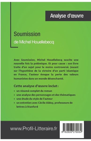 Cet ouvrage fournit une analyse approfondie de Soumission de Michel Houellebecq avec toutes les clés pour analyse l'¿uvre. Avec Soumission, roman de politique-fiction, Michel Houellebecq déclenche la polémique avant même sa publication. En effet, ce roman raconte les circonstances dans lesquelles un parti islamiste gagne l'élection présidentielle française de 2022 et islamise la société, avec la complicité des élites, sans rencontrer aucune résistance. Jean-Michel Cohen Solal nous livre son analyse : on comprend mieux ainsi l'univers désenchanté de Michel Houellebecq suscité par les inquiétudes et les peurs que l'islam cristallise dans un discours unilatéral qui prône la perte des valeurs d'humanisme. François, le personnage principal, souffre d'une crise d'identité, il en est l'archétype, et c'est ce vide religieux caractéristique de l'Occident qui est à l'origine de la « soumission ». Jean-Michel Cohen Solal montre comment la crise de l'Occident et le déclin de la foi peuvent mener à la conversion. La dernière partie de l'ouvrage intitulée « Réception de l'¿uvre » contient un entretien avec Cécile Alduy, professeure de littérature française à l'Université Stanford. Profil Littéraire propose des analyses approfondies faisant le tour complet des plus grandes ¿uvres de la littérature. Notre objectif est de permettre à nos lecteurs d'aller plus loin dans leur expérience de lecture et leur offrir ainsi un nouveau regard sur l'oeuvre concernée. Nos "profils littéraires" sont conçus par des professeurs triés sur le volet et révisés par un comité éditorial constitué de professionnels de la littérature.