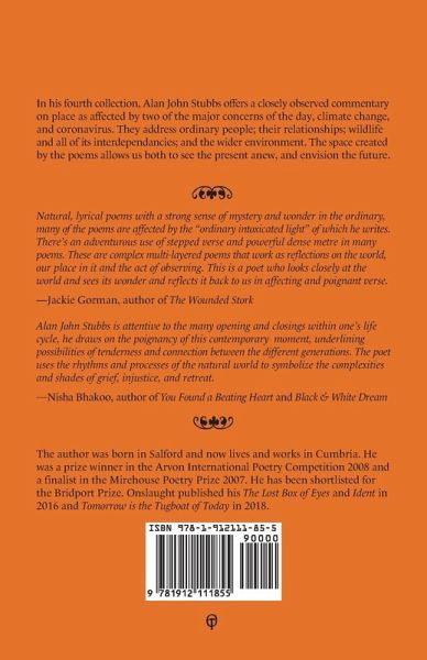 In his fourth collection, Alan John Stubbs offers a closely observed commentary on place as affected by two of the major concerns of the day, climate change, and coronavirus. They address ordinary people; their relationships; wildlife and all of its interdependancies; and the wider environment. The space created by the poems allows us both to see the present anew, and envision the future.