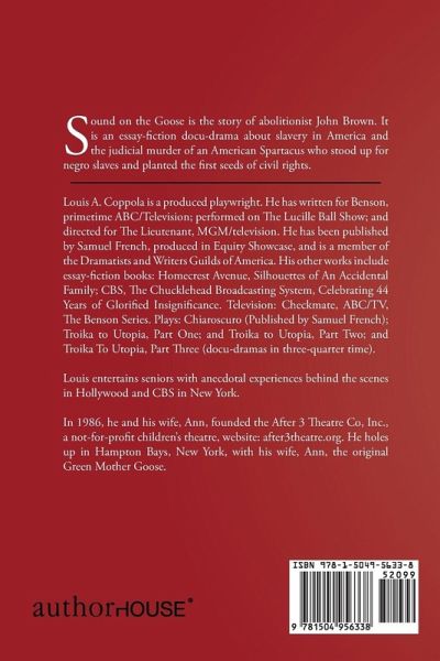 Sound on the Goose is the story of abolitionist John Brown. It is an essay-fiction docu-drama about slavery in America and the judicial murder of an American Spartacus who stood up for negro slaves and planted the first seeds of civil rights.