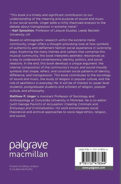 Based on ethnographic research within the extreme metal community, Unger offers a thought-provoking look at how symbols of authenticity and defilement fashion social experience in surprising ways. Exploring the many themes and ciphers that comprise this musical community, this book interprets aesthetic resonances as a way to understand contemporary identity, politics, and social relations. In the end, this book develops a unique argument: the internal composition of the community's music and sound moulds symbols that shape, reflect, and constrain social patterns of identity, difference, and transgression. This book contributes to the sociology of sound and music, the study of religion in popular culture, and the role of aesthetics in everyday life. It will be of interest to upper level students, post-graduate students and scholars of religion, popular culture, and philosophy.