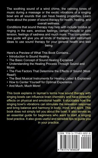 The soothing sound of a wind chime, the calming tones of music during a massage or the exotic vibrations of a singing bowl are all sounds that can have healing properties. Learn more about the power of sound therapy for health, healing, and overall wellness. Conditions that sound therapy may help with include tinnitus or ringing in the ears, anxious feelings, certain muscle or joint tension, feelings of sadness and much more. This comprehensive guide will give you all kinds of therapies and instrument ideas to use sound therapy for your general health and well being Here's a Preview of What This Book Contains...Introduction to Sound Healing The Basic Concept of Sound Healing Explained Understanding the Healing Process Through Sound and Music The Five Factors That Determine the Effects of Sound (Must Read!) The Best Musical Instruments for Healing Listed & Explained How to Center Yourself for Optimal Experience And Much, Much More! This book explains in layman's terms how sound therapy with singing bowls can influence brain chemistry and have powerful effects on physical and emotional health. It elucidates how the singing bowl's vibrations can stimulate the relaxation response and bring balance and harmony in body, mind, and spirit. This book does not simply tell you about the bowl. It also serves as an essential guide for beginners who want to start a singing bowl practice. It also gives useful and sensible tips to guide you in your practice.