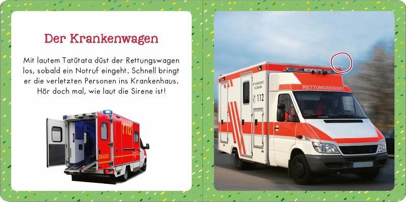 Tatütata! Die Sirenen von Feuerwehr und Rettungswagen heulen, das Polizeimotorrad röhrt auf. Doch wie klingt der Rettungshubschrauber, das Löschboot und der Abschleppwagen? In diesem ersten Soundbuch können schon die Allerkleinsten tolle Fahrzeuggeräusche im Einsatz entdecken. Einfach auf das Fahrzeug drücken und das passende Geräusch anhören. Das allererste Soundbuch mit hochwertigen Fotos und 6 Soundmodulen begeistert Eltern und Kleinkinder ab 12 Monaten und macht das erste gemeinsame Lesen zu einem interaktiven Erlebnis für alle Sinne.