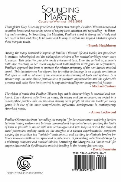 Sounding the Margins: Collected Writings 1992-2009 by composer, performer, humanitarian, and Deep Listening¿ founder Pauline Oliveros document her activity over this period and the many recent advances that have taken place in the fields of electronic and telematic musical performance, improvisation, artificial intelligence, and the role of women in contemporary music. Featuring contributions by John Luther Adams, Monique Buzzarté, and Stuart Dempster.