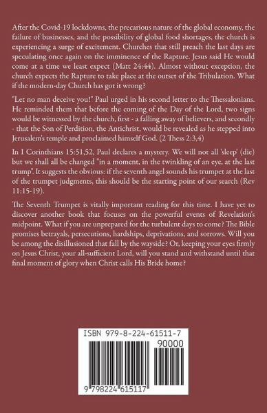 After the Covid-19 lockdowns, the precarious nature of the global economy, the failure of businesses, and the possibility of global food shortages, the church is experiencing a surge of excitement. Churches that still preach the last days are speculating once again on the imminence of the Rapture. Jesus said He would come at a time we least expect (Matt 24:44). Almost without exception, the church expects the Rapture to take place at the outset of the Tribulation. What if the modern-day Church has got it wrong? "Let no man deceive you!" Paul urged in his second letter to the Thessalonians. He reminded them that before the coming of the Day of the Lord, two signs would be witnessed by the church, first - a falling away of believers, and secondly - that the Son of Perdition, the Antichrist, would be revealed as he stepped into Jerusalem's temple and proclaimed himself God. (2 Thess 2:3,4) In I Corinthians 15:51,52, Paul declares a mystery. We will not all 'sleep' (die) but we shall all be changed "in a moment, in the twinkling of an eye, at the last trump". It suggests the obvious: if the seventh angel sounds his trumpet at the last of the trumpet judgments, this should be the starting point of our search (Rev 11:15-19). The Seventh Trumpet is vitally important reading for this time. I have yet to discover another book that focuses on the powerful events of Revelation's midpoint. What if you are unprepared for the turbulent days to come? The Bible promises betrayals, persecutions, hardships, deprivations, and sorrows. Will you be among the disillusioned that fall by the wayside? Or, keeping your eyes firmly on Jesus Christ, your all-sufficient Lord, will you stand and withstand until that final moment of glory when Christ calls His Bride home?