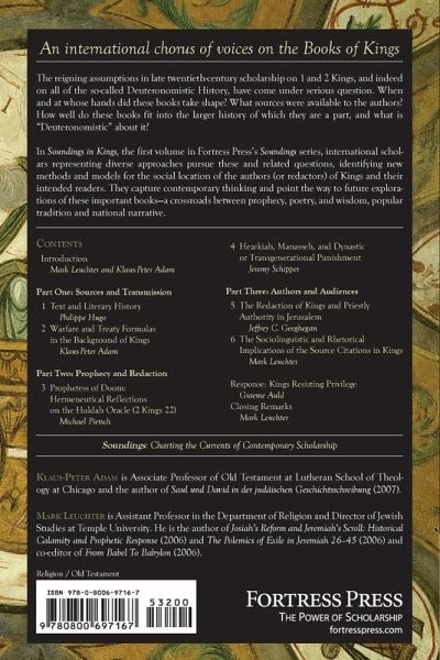 The reigning assumptions in 1970s and 1980s scholarship on 1 and 2 Kings, and indeed on all of the Deuteronomistic history, have come under serious question. How can differing views of that history be reconciled? What sources were available to the authors? Should we call them "authors"? How well do the Books of Kings fit into the larger history of which they are a part; just who composed that history, toward what end, and in what context? How do the assumptions of contemporary interpreters influence the answers we give to those questions? In Soundings in Kings, international scholars pursue these and related questions by examining 1 and 2 Kings as an independent work, identifying new methods and models for envisioning the social location of the authors (or redactors) of Kings, the nature of the intended audience or audiences, and the political and rhetorical implications of its construction. Soundings in Kings demonstrates the role of Kings as a cornerstone work within the Hebrew Bible, a crossroads between prophecy, poetry, wisdom, ancestral and national narrative, and ritual instruction. Soundings: Charting the Currents of Contemporary ScholarshipThe Soundings series gathers current perspectives on the state of biblical scholarship on selected questions.