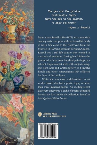 The pen and the palette Continually fight; Says the pen to the palette, "I know I'm write!" -Myna A. Russell Myna Ayers Russell (1884-1975) was a twentieth century artist and poet with an incredible body of work. She came to west in 1920 and settled in Portland, Oregon. Russell was a still life painter who worked in a variety of mediums. During her lifetime she produced at least four hundred paintings in a vibrant Impressionist style with subjects ranging from Arts and Crafts pottery to beautiful florals and other compositions that reflected her love of the outdoors. While she was most widely-known in art world, Russell also had a poetic legacy of more than three hundred poems. An exciting recent discovery uncovered a cache of poems compiled here for the first time in the collection, Sounds at Midnight and Other Poems.